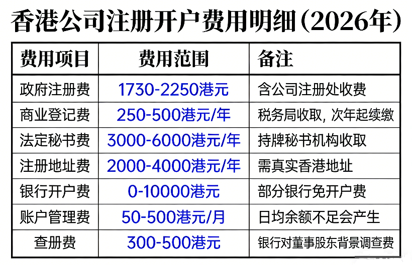 二、香港公司注册开户费用:2026年明细清单